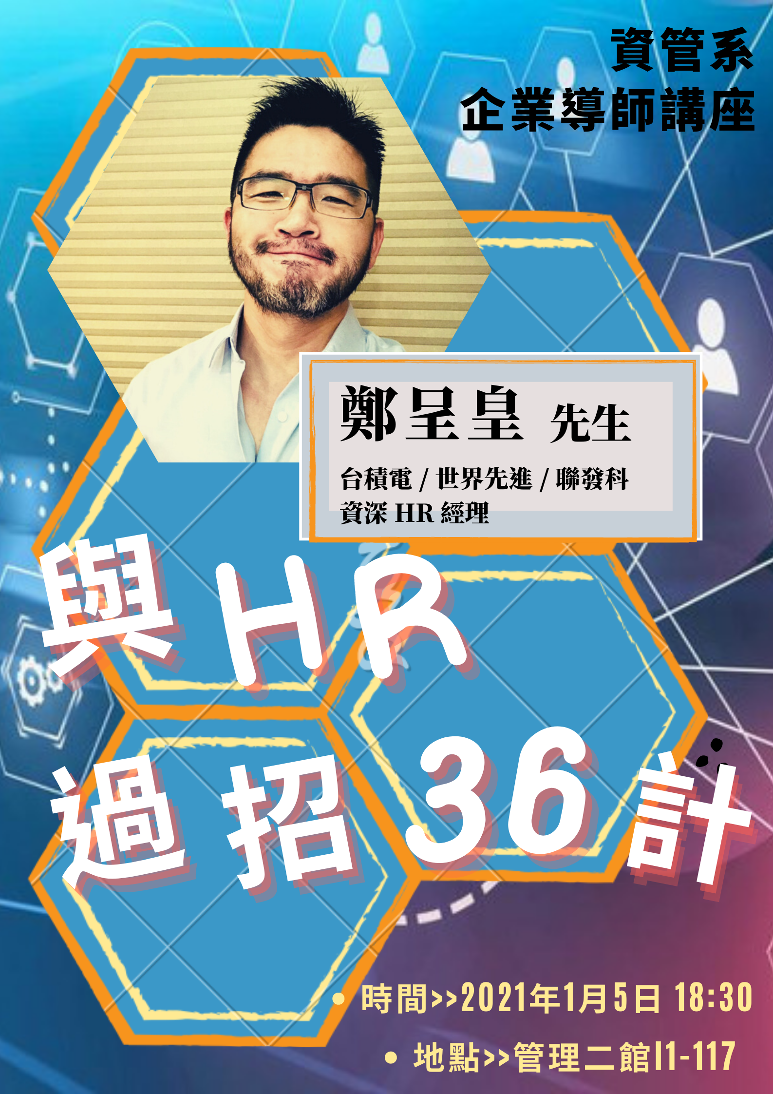 演講主題:與HR過招36計日期:1/5(二) 18:30 管二館 I1-117主講人:鄭呈皇 先生講者介紹:台積電 / 世界先進 / 聯發科 資深 HR 經理
