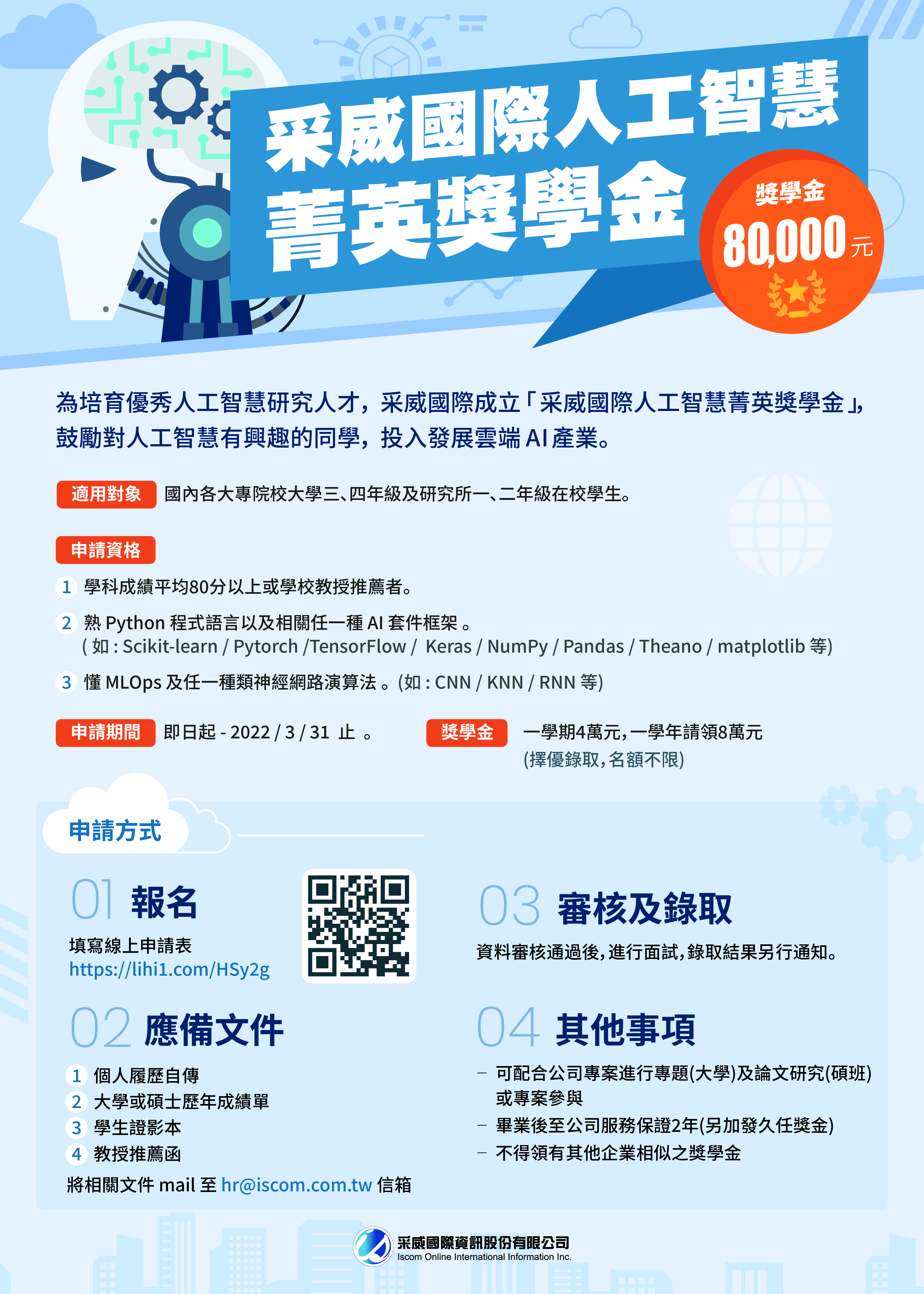 - 申請方式參閱DM說明,活動洽詢窗口: (04)23265200 分機359謝小姐 /分機326傅小姐、 Email:hr@iscom.com.tw