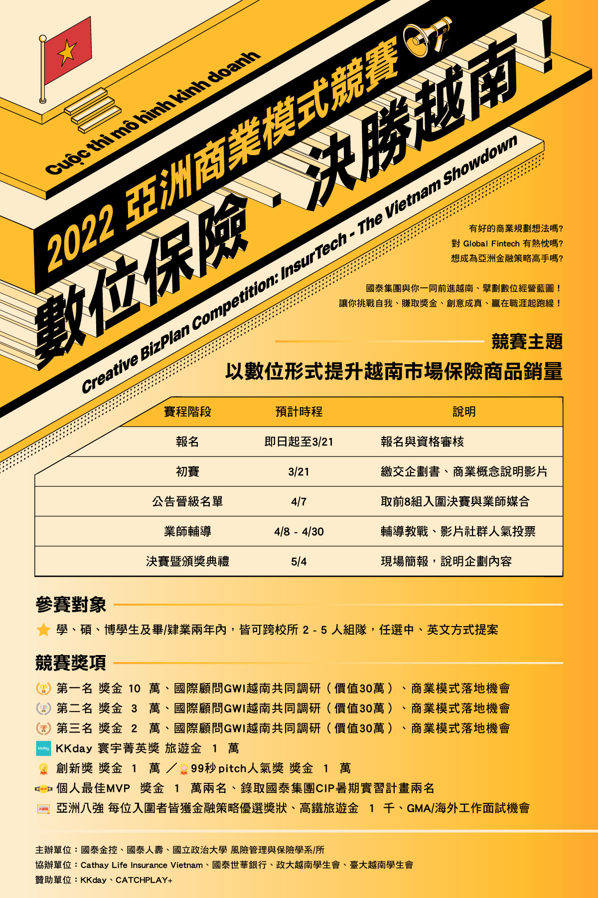 - 獲獎Tips:以越南為目標市場,規劃銷售人身保險的商業模式,可蒐集符合越南民情的獲客方式,或是透過數據與技術幫助保險行銷及客戶經營。方向不設限,提案中建議包含市場調研、提案可達之效益、執行策略以及所需技術或資源等構面,說一個吸引投資人的故事!