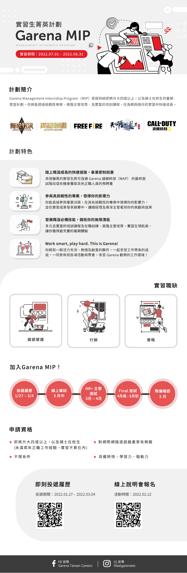 【2022 Garena MIP 實習生菁英計劃1/27~3/4 開放申請!】