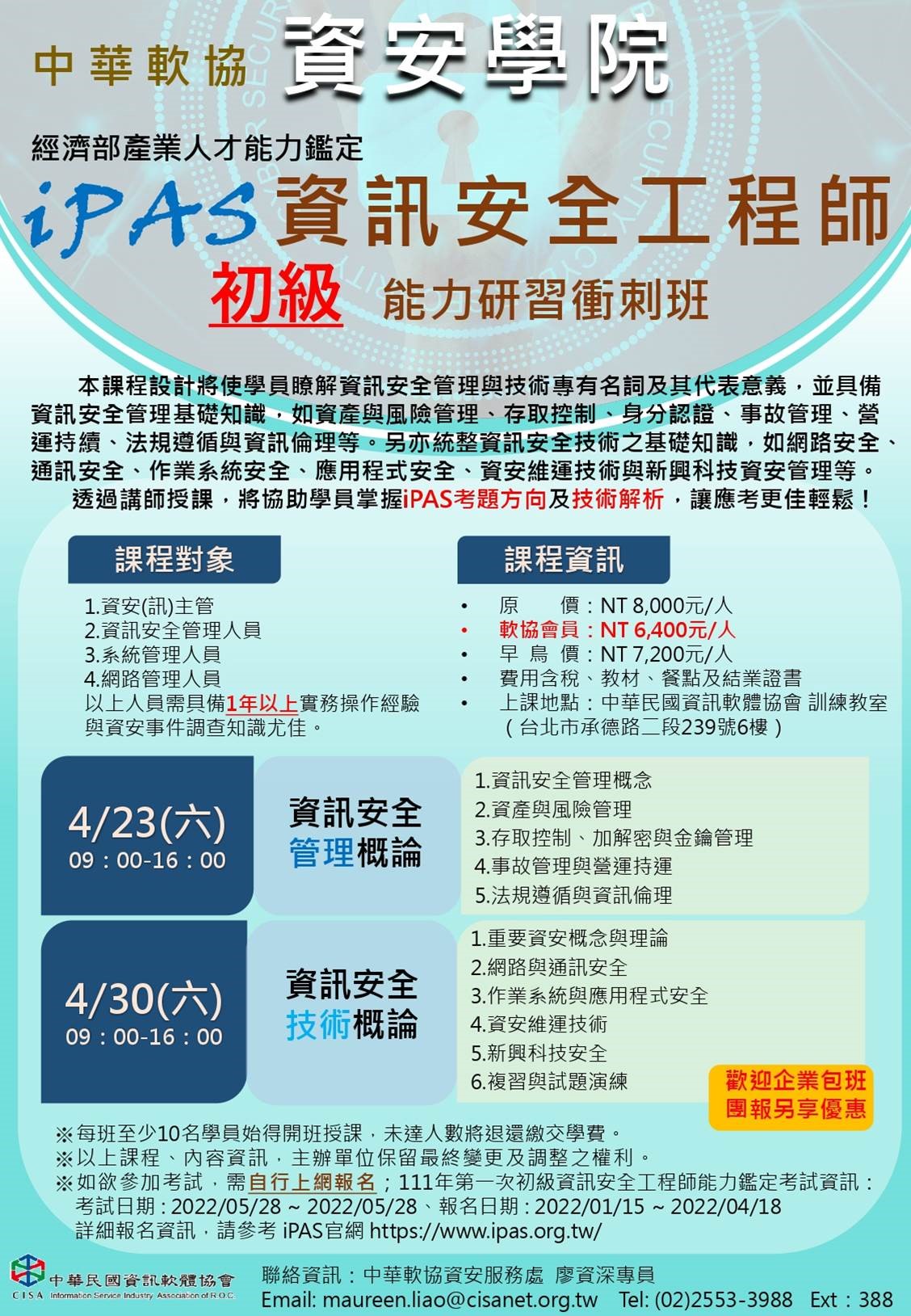 中華民國資訊軟體協會於2022年四月份即將開立「iPAS-初級 資訊安全工程師」能力研習衝刺班,