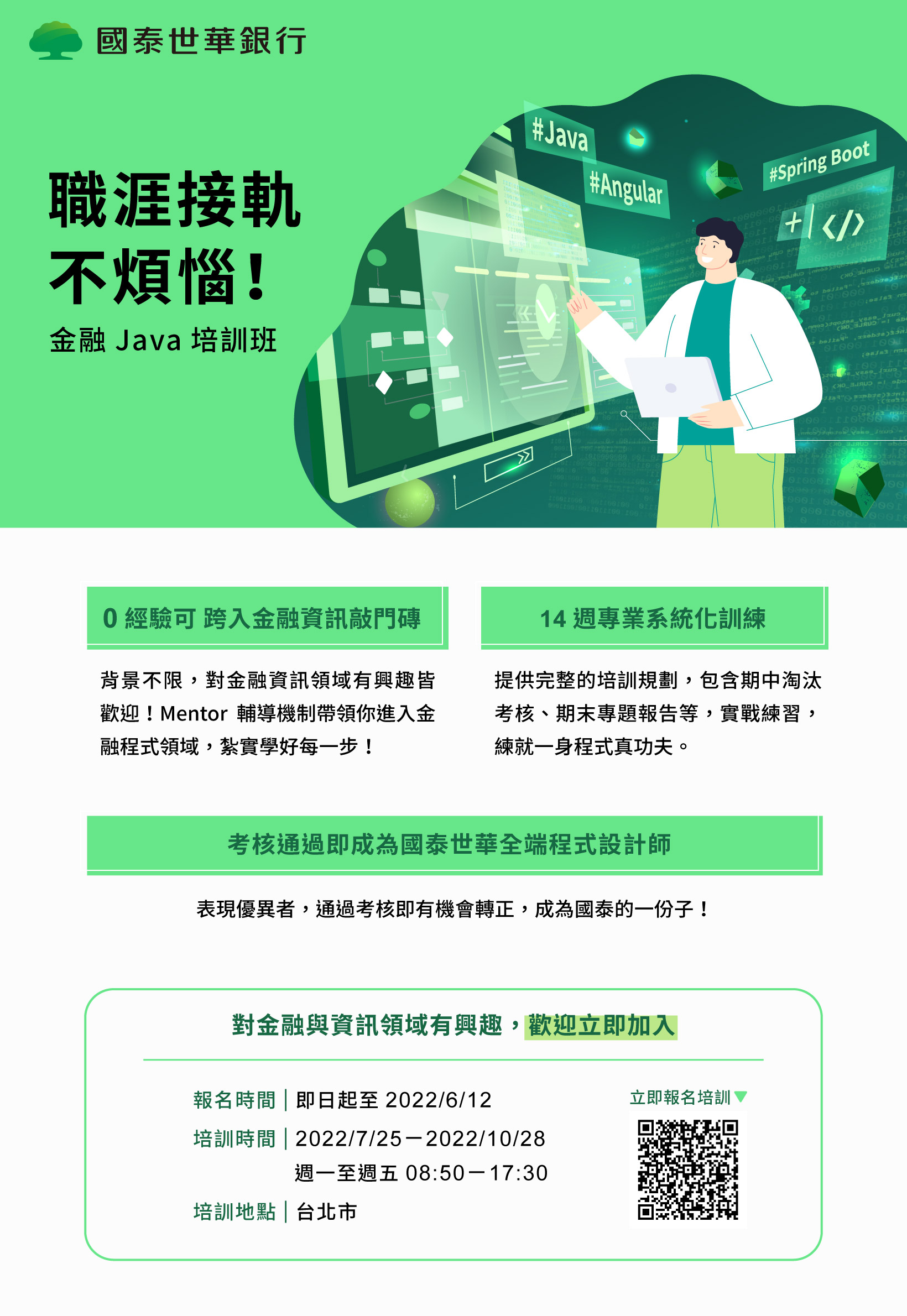 - 報名方式 : 請至國泰人才招募網站投遞【資訊培訓班】金融Java培訓班職缺 : 點選連結