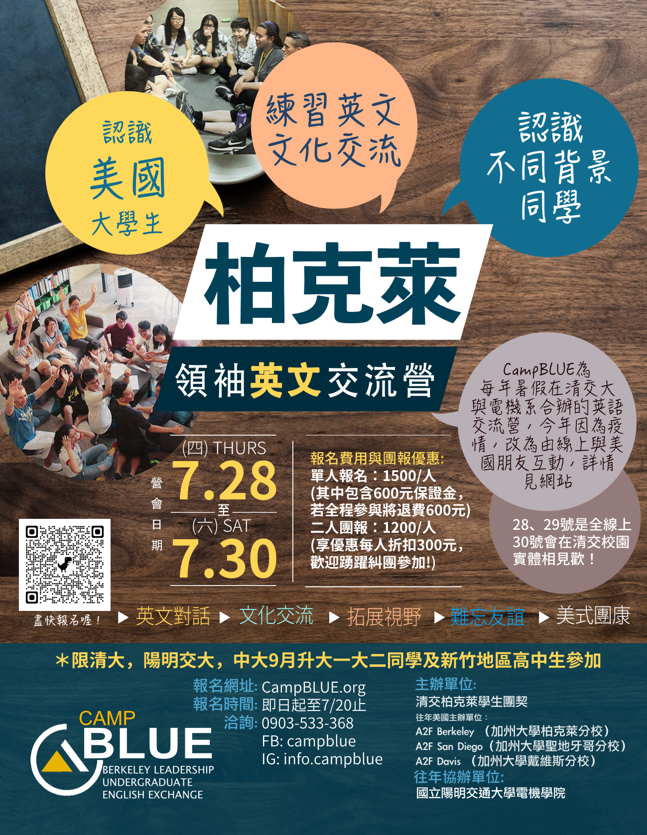 我們是「陽明交通大學柏克萊學生團契社團 Koinonia」,每年的暑假我們都會與大約30位的美國學生一同舉辦Camp BLUE (Berkeley Leadership Undergraduate English Exchange) 英文交流營隊給當年度即將入學的新生及升大二的學生,會由美國同學作一些英文的報告並帶領分享時間,清交的學長姐會帶大家認識校園,也會有大學經驗分享的時間。