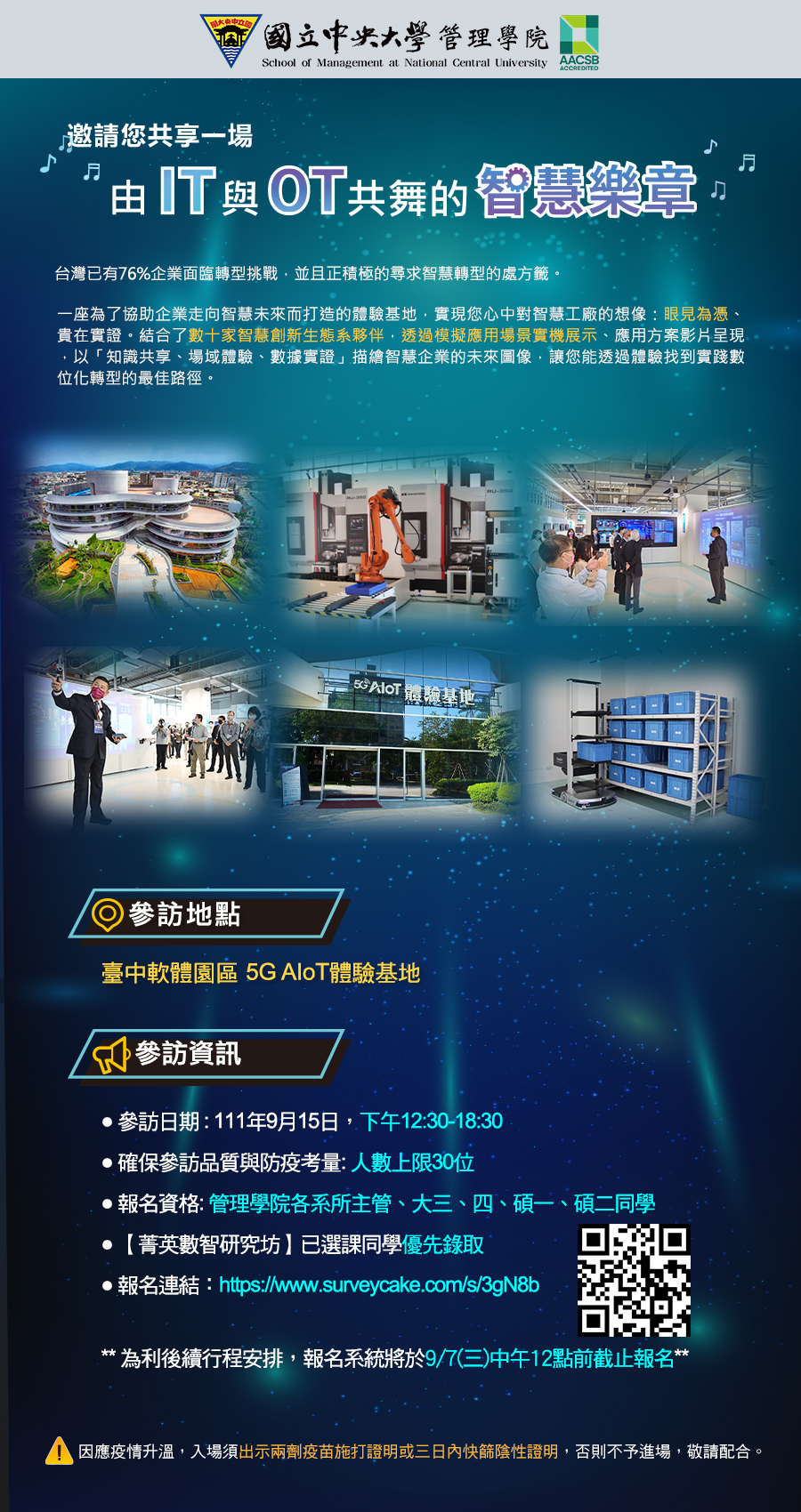 因應疫情考量,名額限制30人(菁英數智研究坊已選課同學優先錄取),當天也將有專車接送,鼓勵有意願的主管與同學們踴躍報名參加!