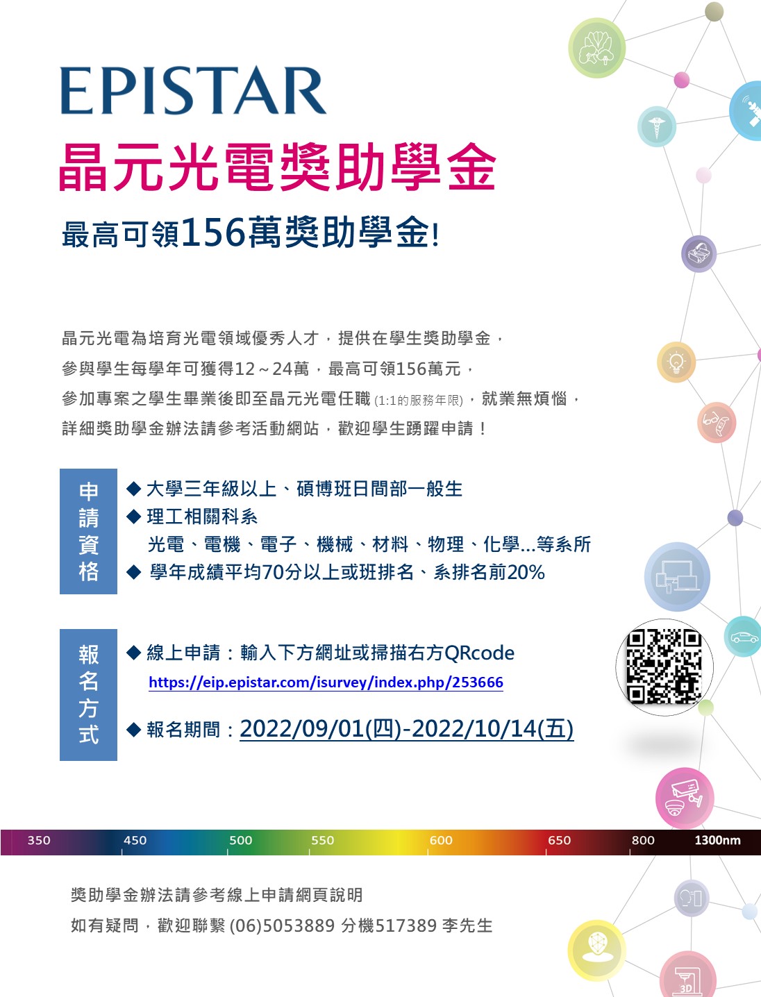 【獎學金】晶元光電獎助學金已開放申請至10/14(五)