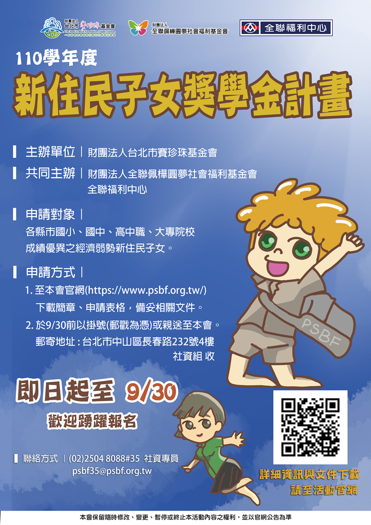 「賽珍珠基金會110學年度新住民子女獎學金」開放申請中,即日起至9月30日止(郵戳為憑),歡迎各大專院校成績優異新住民子女踴躍報名,獲獎者每名獎金一萬元,簡章、申請表格請至賽珍珠基金會下載,網址https://www.psbf.org.tw/article/185,歡迎新住民子女踴躍報名申請!!!