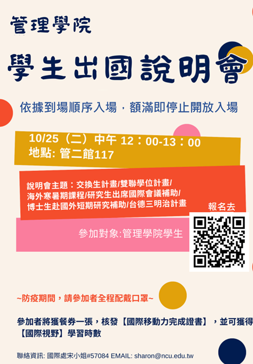 【其他】管理學院─學生出國說明會報名表_10/25 (二) 12:00-/ 管二館 117