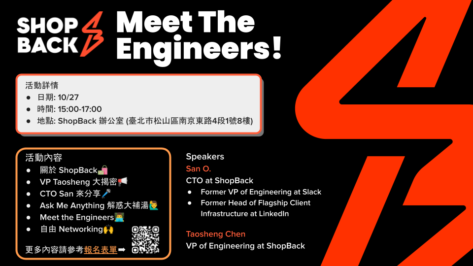 這次特別從新加坡邀請到在矽谷LinkedIn & Slack 歷練多年的 CTO San 以及台灣的 Engineering VP Taosheng 來跟大家分享,認識 ShopBack 的 Global Engineering Teams!