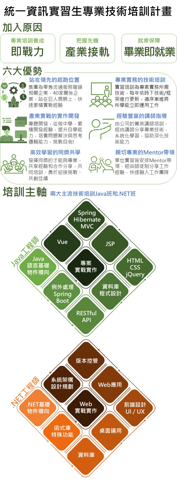 - 專業技術培訓:量身規劃培訓課程,分JAVA跟.NET兩個技術專班,培訓過程除講師授課外,將搭配實作、作業、報告等方式並定期驗證成果。實習計畫結束前將進行測驗,通過期末測驗之學員,將可至統一資訊任職,同學們能畢業即就業,並可以於工作中發揮所學的技術專長。