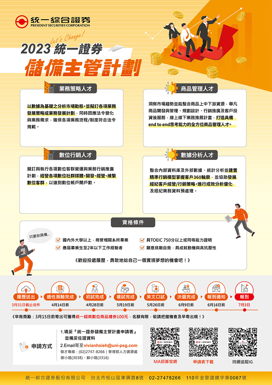 【徵才】2023統一證券儲備主管計劃甄選活動,3/31報名截止,3/15前提供申請表與書審資料,送數位商品禮券100元!
