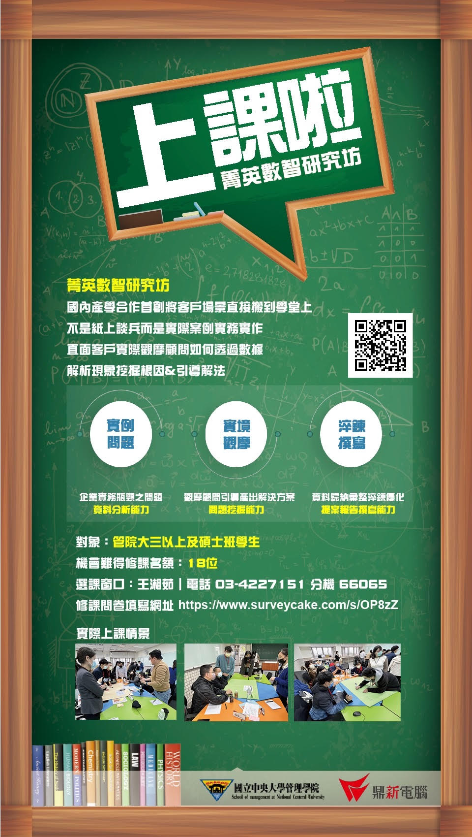 歡迎大三以上及碩士班同學選修,修課名額18位,機會難得,鼓勵踴躍報名!