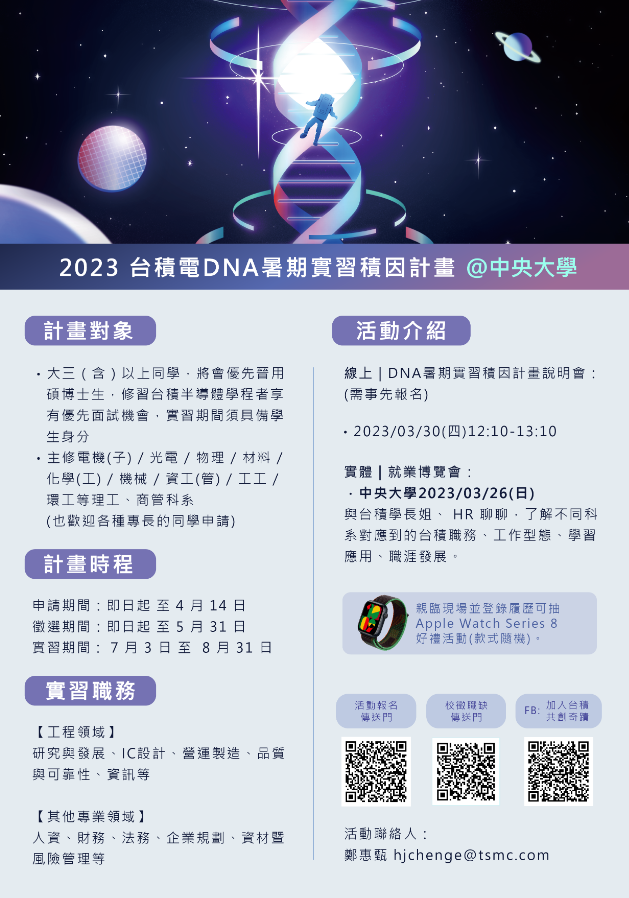 • 實體|就業博覽會:與台積學長姐與HR聊聊,了解不同科系對應到的台積職務、工作型態、學習應用、職涯發展,親臨現場並填履歷可抽Apple Watch Series 8(款式隨機)