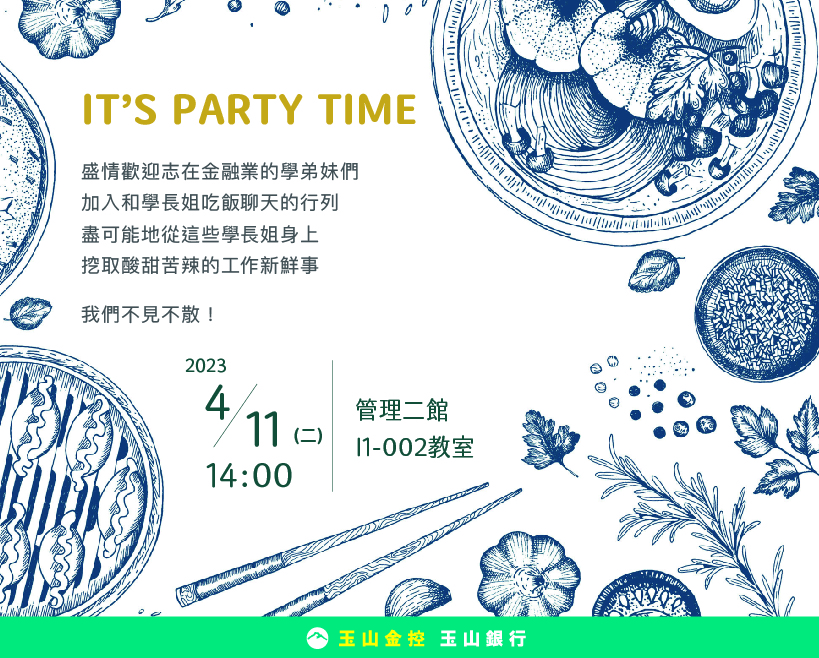 玉山銀行近期將前進校園,舉辦茶會活動!歡迎加入和學長姐吃飯聊天的行列,盡可能地從這些人生前輩們身上,挖取在江湖走跳的秘笈,我們不見不散!