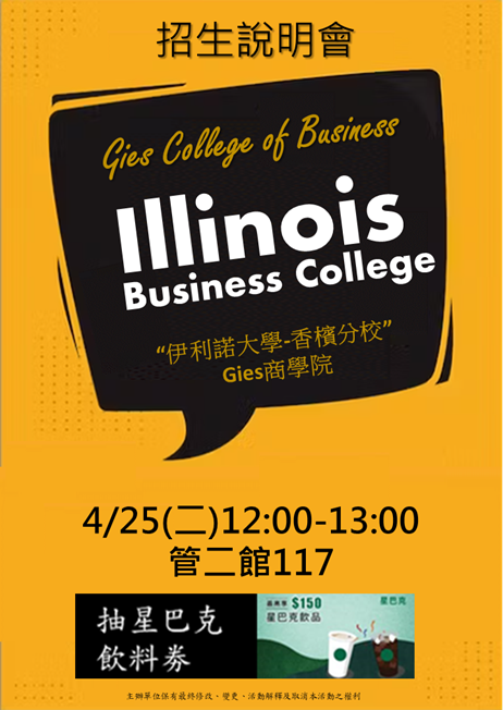 伊利諾大學-香檳分校 /Gies商學院,將於4/25辧理碩士班招生說明會,歡迎同學們報名參加。