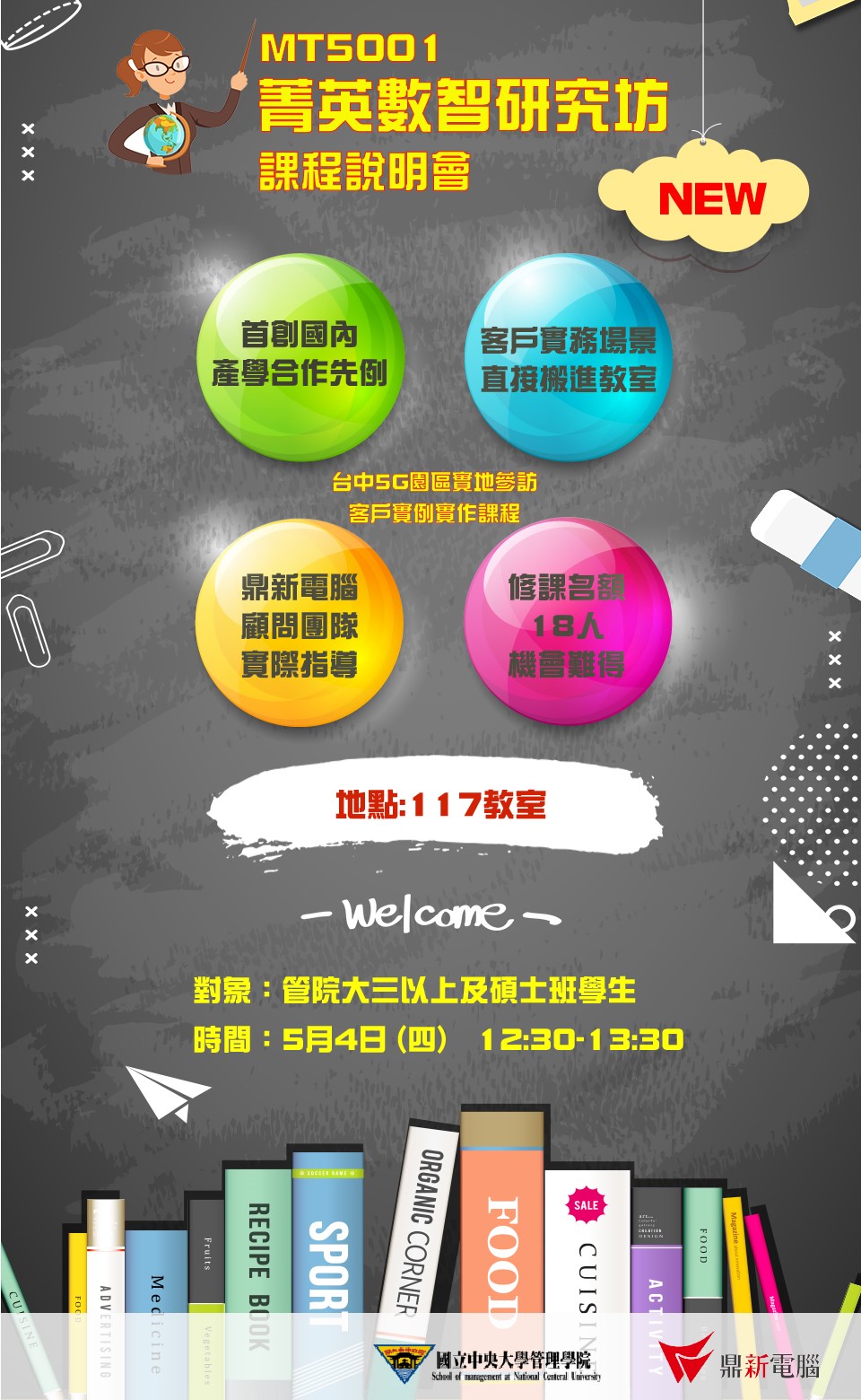 為讓同學們更瞭解課程內容,於5月4日(四)進行兩梯次說明會,歡迎有意願修課的同學把握機會參加!