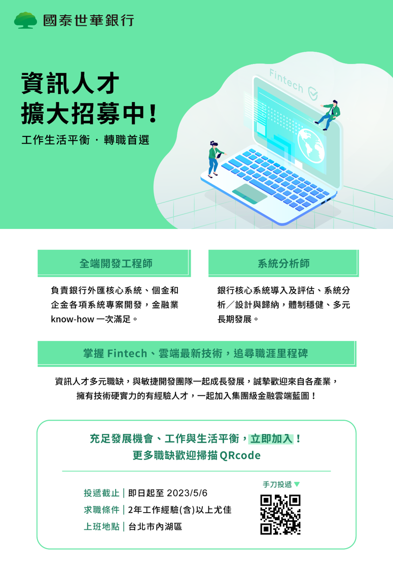 近期國泰世華銀行積極尋覓優秀資訊人才,如對於金融產業資訊相關工作具高度興趣者,歡迎投遞職缺 !