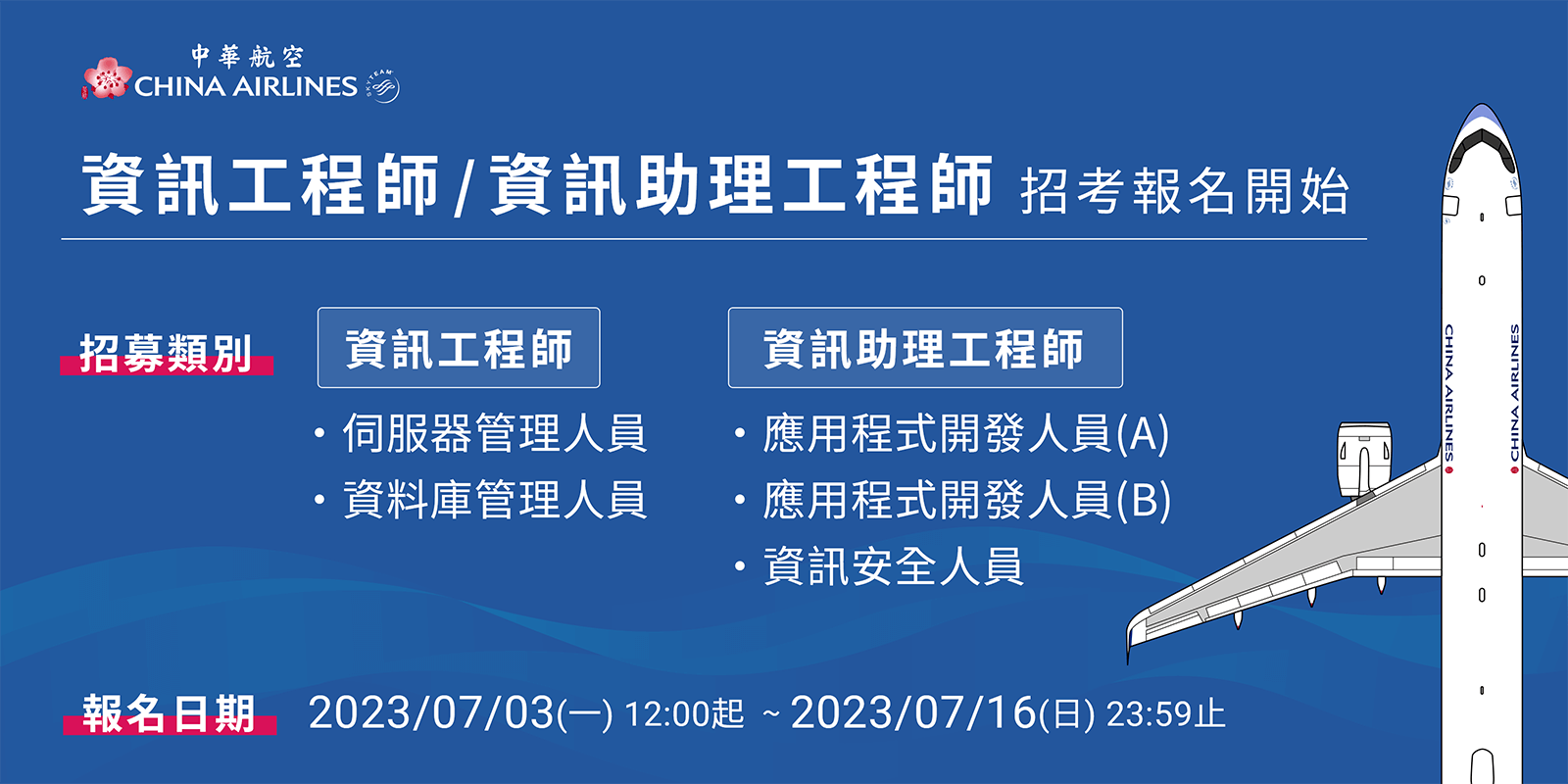 【轉發】中華航空2023年度第二次「資訊工程師/資訊助理工程師」招募訊息