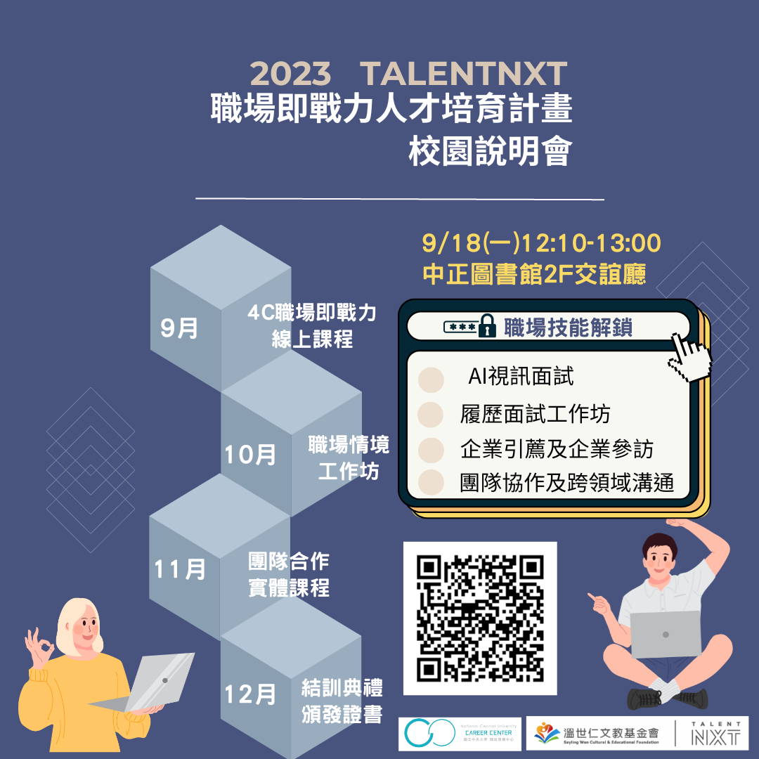 【講座】2023「TalentNXT 職場即戰力人才培育計畫」中大校園說明會9/18,歡迎同學參加!