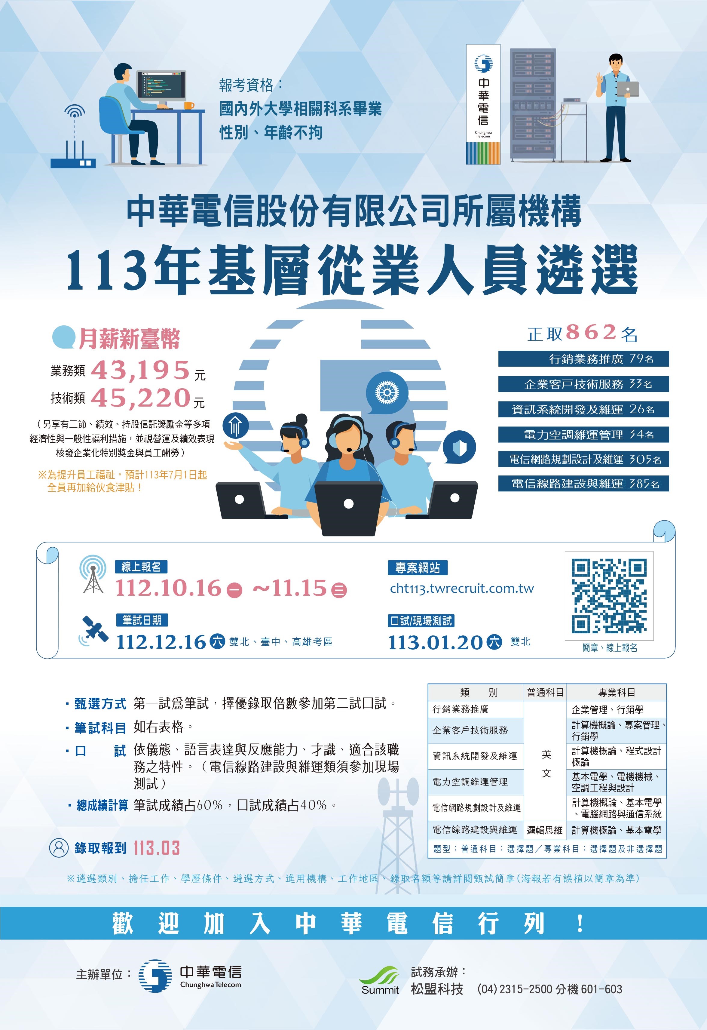 「中華電信股份有限公司所屬機構113年基層從業人員遴選」簡章暨招考訊息