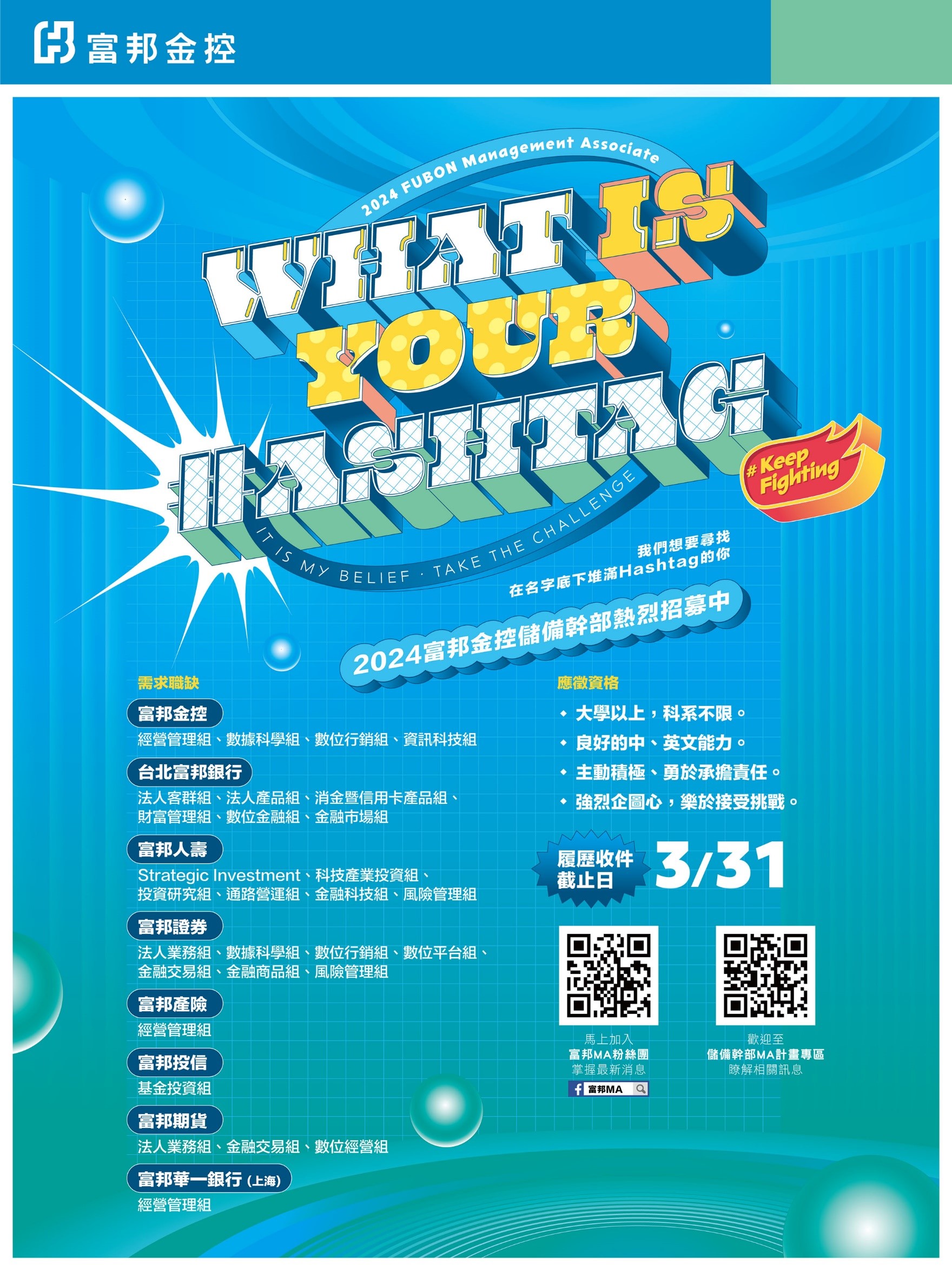 2024富邦金控儲備幹部MA徵才中,加入台灣最具頂尖經營績效與完整金融版圖的富邦金控,
