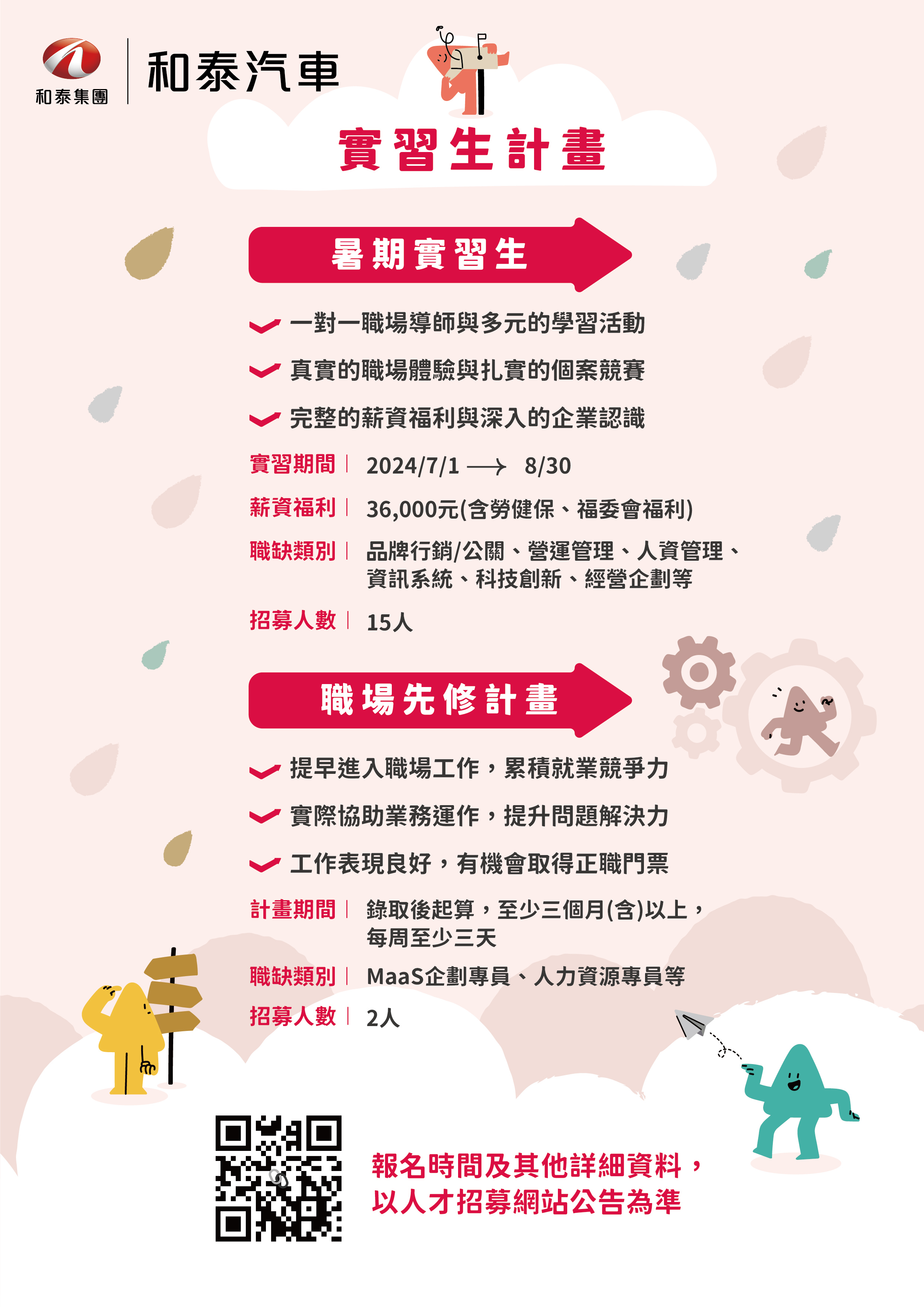 【實習職缺】後續將以履歷、志願調查、面談結果綜合評估,進行分發,品牌行銷/公關、營運管理、人資管理、資訊系統、經營企劃、科技創新等