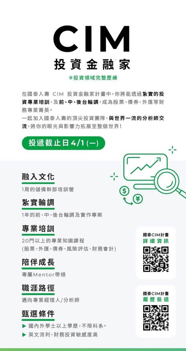 【2024年國泰人壽儲備幹部計畫-CIM投資金融家】(4/1 投遞截止)
