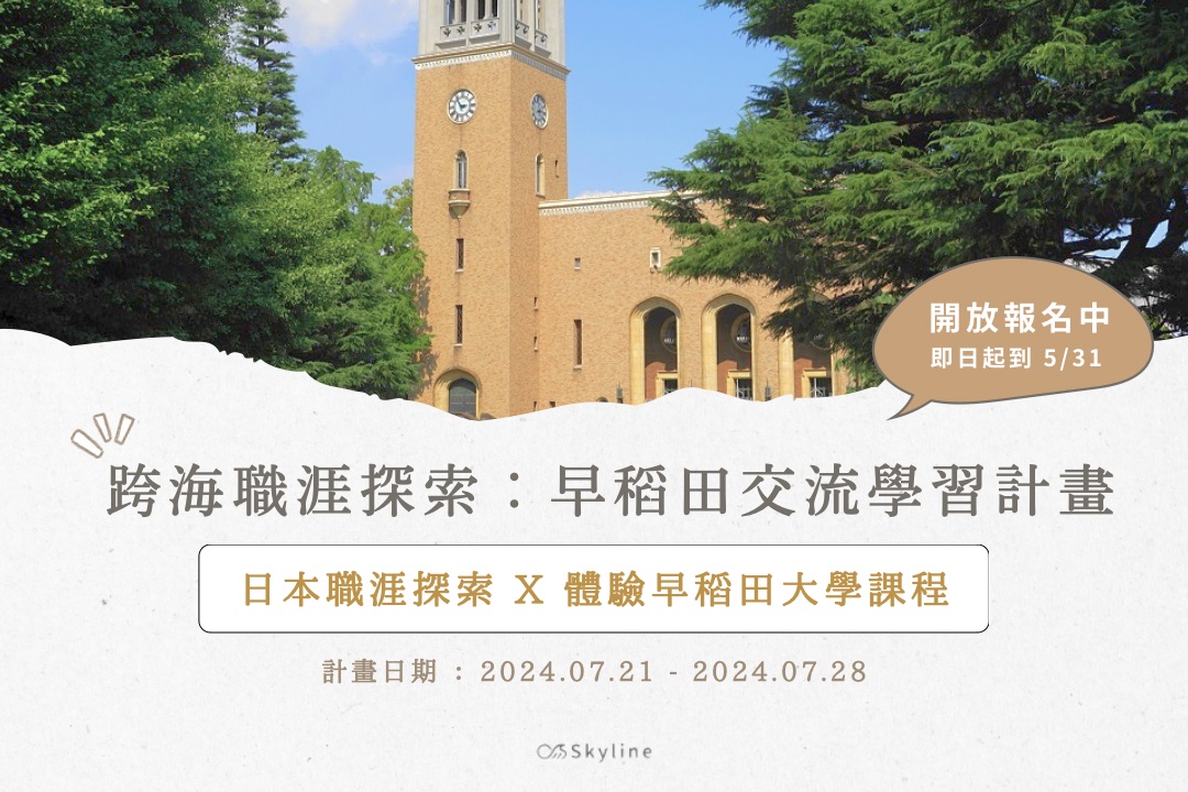 - 為深化台灣青年國際競爭力、增進台日青年間的學術交流、加強日本產業界連結,及實地瞭解日本職場文化,敝司自2024年起辦理「Skyline 2024 跨海職涯探索:早稻田交流學習計畫」參訪活動,結合全球知名大學早稻田大學專業課程、結案競賽,甄選優秀台灣大學生赴日早稻田大學上課,並與日本企業夏季交流、參訪、見習。