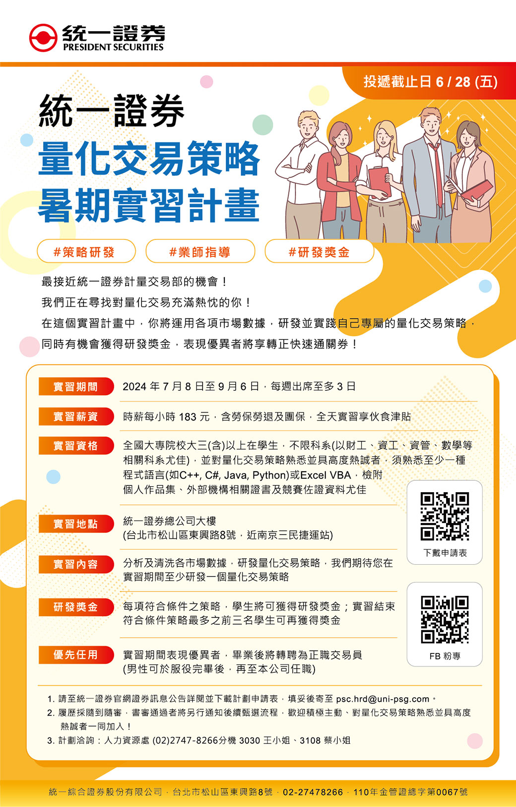 【報名方式】自即日起至6/28,請至統一證官網證券訊息公告詳閱實習計劃資訊,並下載計劃申請表填妥後寄至PSC.HRD@uni-psg.com