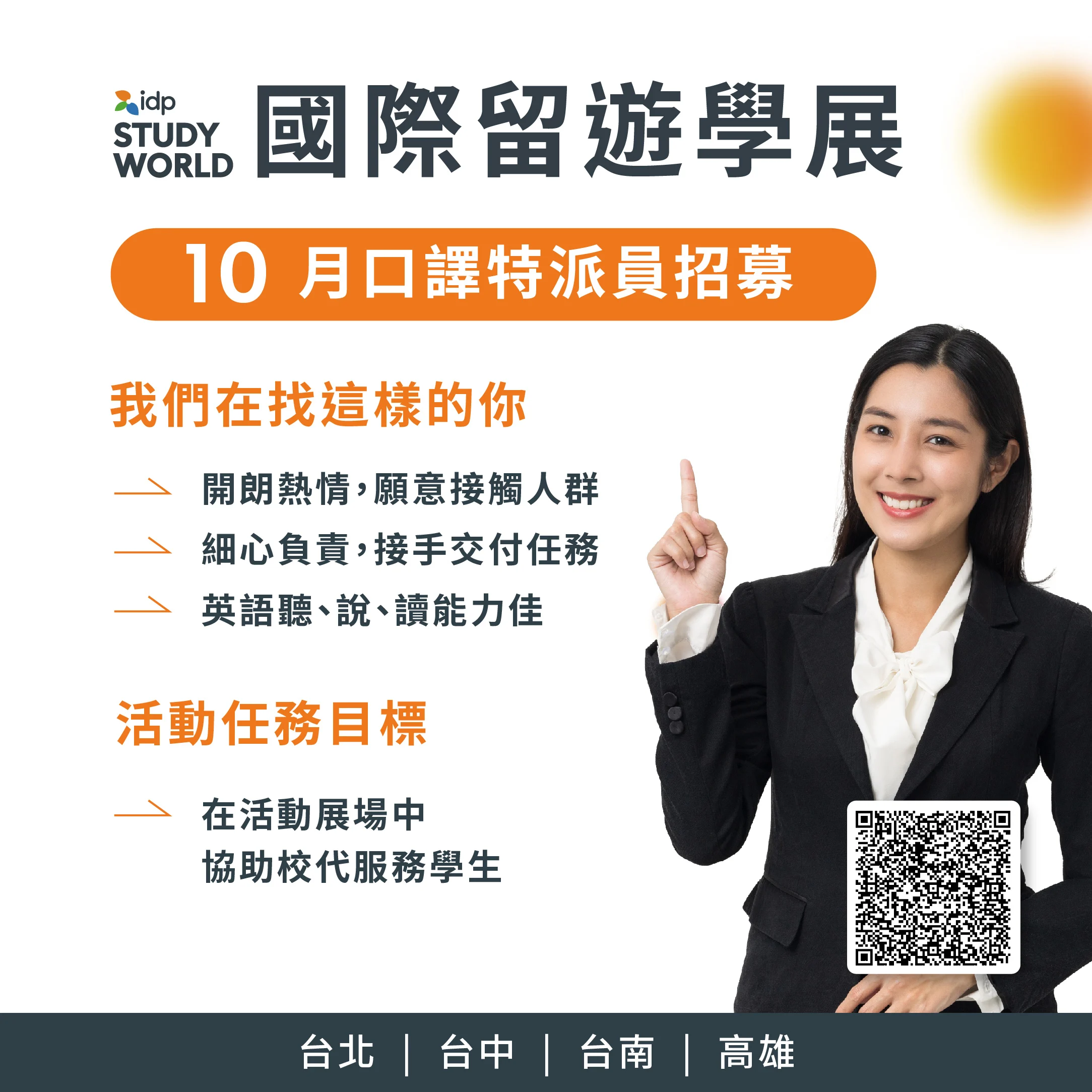2024 IDP Study World 國際遊留學展將在臺北、臺中、臺南及高雄與大家見面,各場次正在尋找口譯特派員!