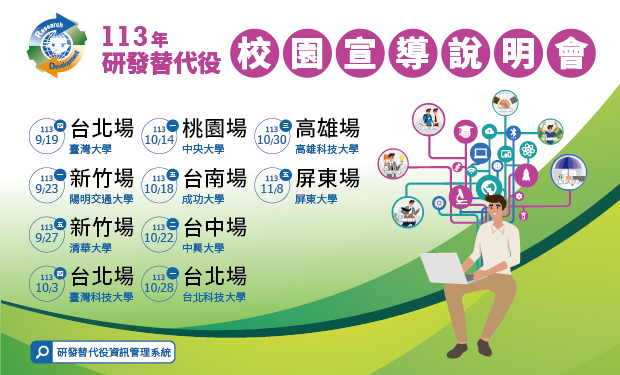 為提升尚未履行兵役義務之研究所以上學生,對研發替代役制度之認識,歡迎踴躍至「研發替代役資訊管理系統」報名參加113年研發替代役制度校園宣導說明會,役男在瞭解個人權利義務之餘,還有機會把商品券帶回家!