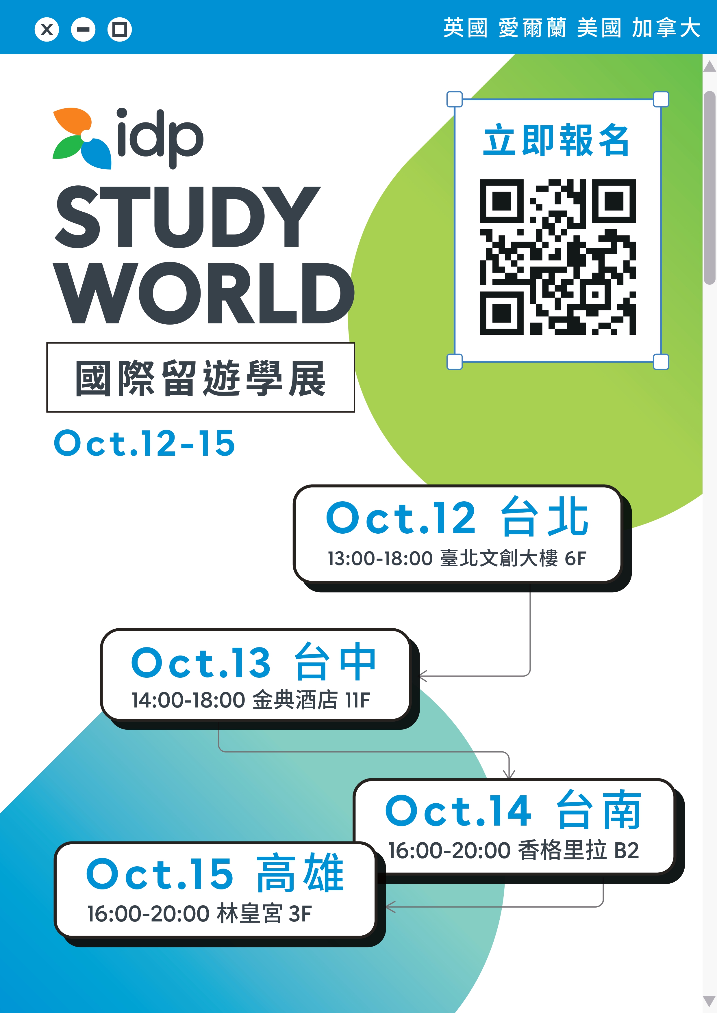 台灣規模最大、名校最多的留學盛會,2024 IDP STUDY WORLD 國際留遊學展將於 10月12日至10月15日在台北、台中、台南和高雄巡迴展出。