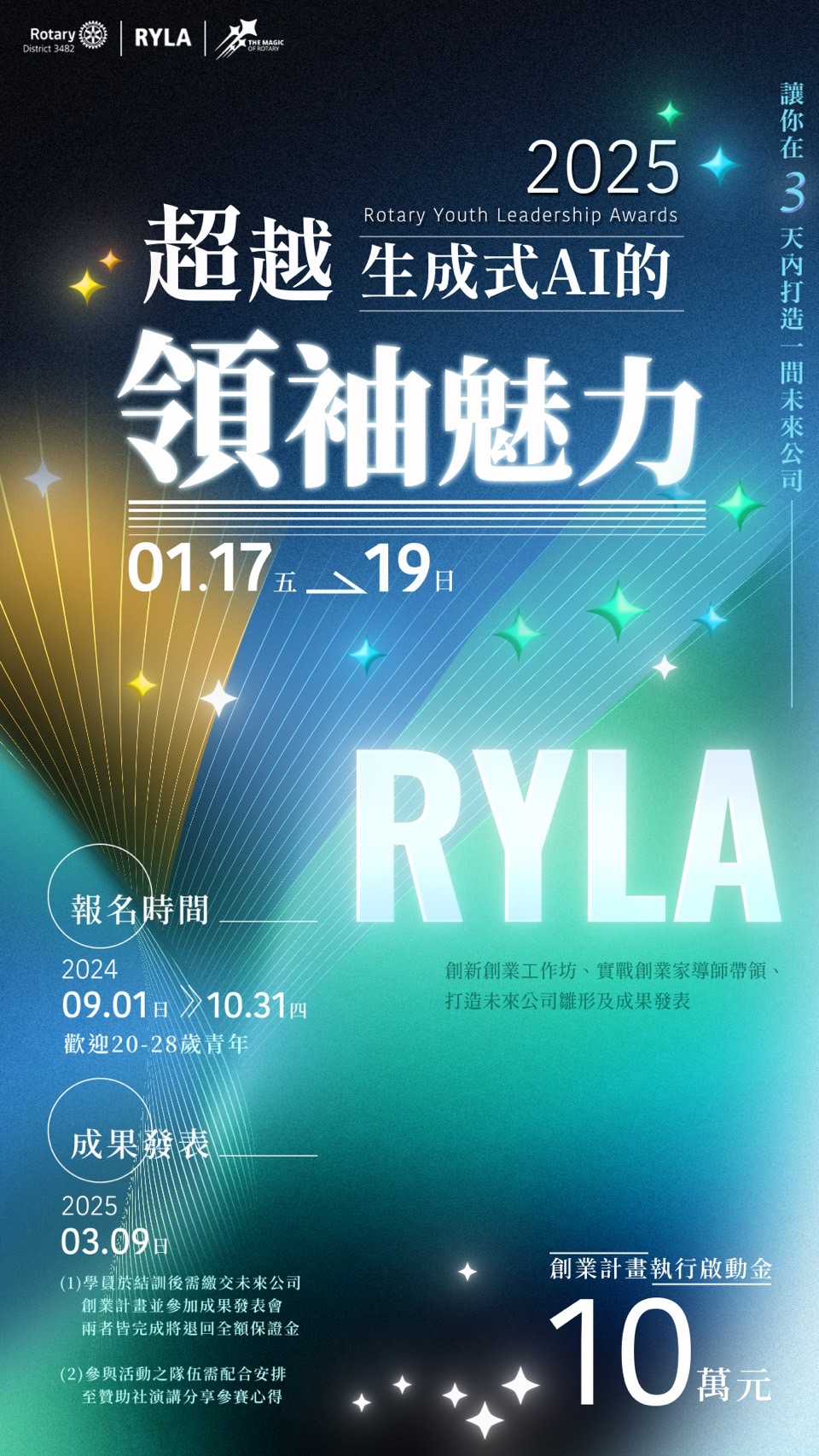 為因應全球產業變化,國際扶輪 RYLA 活動設立初衷,培育國際領袖人才,協助有志創業的大專院校學生,透過為期 3 天的訓練營激發對創新和創業的熱情,該計劃引進美國矽谷創新創業的 YES! (Young Entrepreneurs Symposium), 並聘請計劃主持人 Prof. Eric 為課程設計顧問,將為參與者提供創業原則的基礎理解、創新過程、產品與科技開發及推銷商業創意的實用技能,活動包括:創新創業工作坊、實戰創業家 導師帶領、打造未來公司雛形及成果發表,更提供創業計畫執行啟動金 10 萬元當作獎勵。國際扶輪 3482 地區RYLA 委員會,期盼開辦「超越生成式 AI 的領袖魅力」訓練營,除了讓學員了解國際扶輪七大焦點領域:和平與預防/解決衝突、預防與治療疾病、水衛生、母親與兒童健康、基礎教育與識字、經濟與社區發展、支持環境保護,獲得美國矽谷的第一手創業心法,透過創業導師 2 個月的實戰帶領,最終在成果發表中展現團隊中最好的 IDEA, 藉此開拓創業領袖的第一。