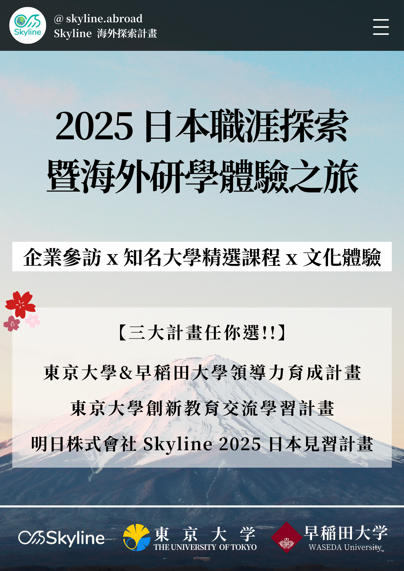 一、為深化台灣青年國際競爭力、增進台日青年間的學術交流、加強日本產業界連結,及實地瞭解日本職場文化,敝司自2025年起辦理「2025 日本職涯探索暨海外研學體驗之旅」參訪活動,結合全球知名大學東京大學及早稻田大學專業課程、結案競賽,甄選優秀台灣大學生赴日東京大學及早稻田大學上課,並與日本企業冬季交流、參訪、見習。