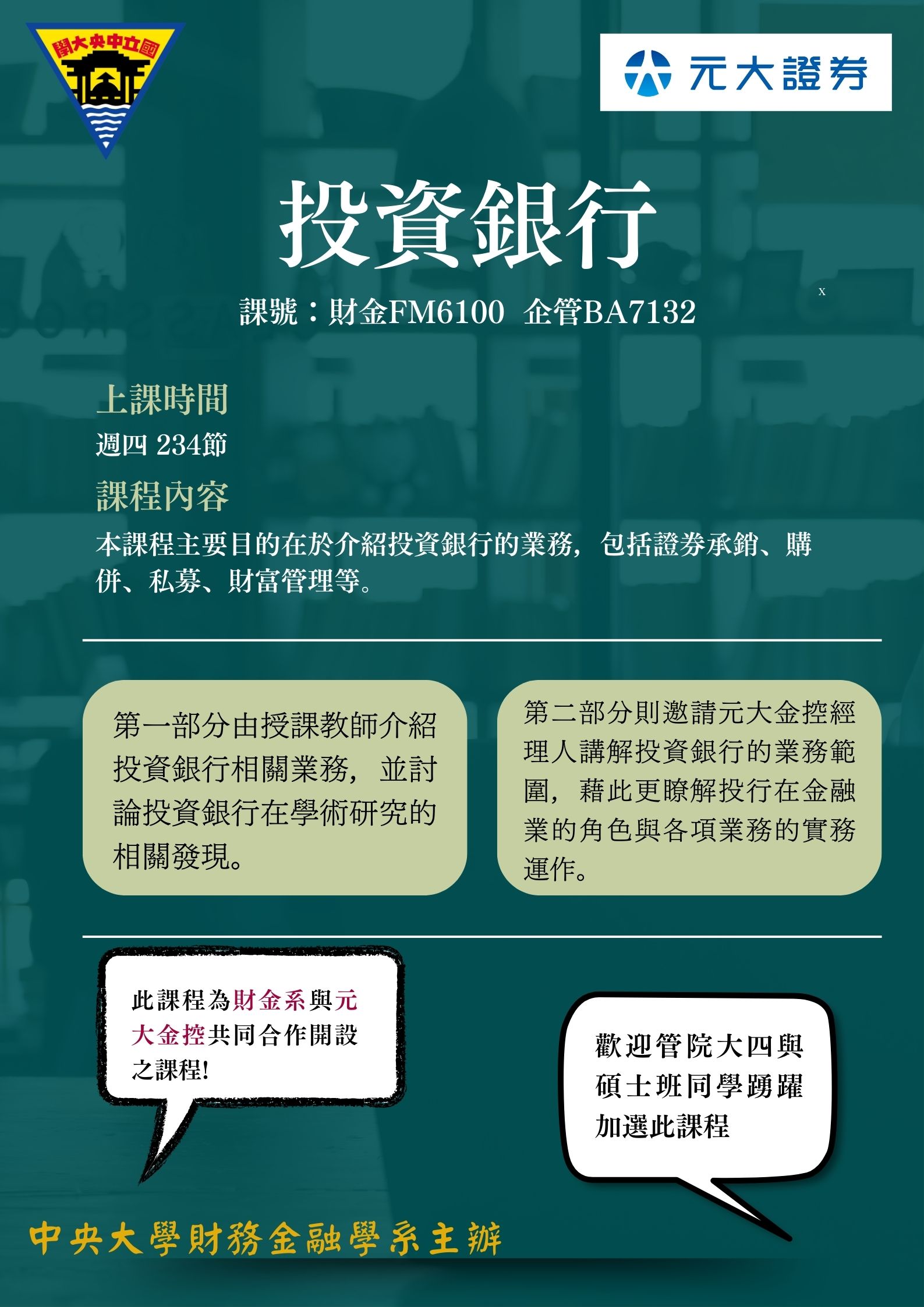 財金系於1132學期,與<新光人壽>與<元大金控>兩企業進行合作課程(如附件海報),課堂上邀請專業且資深的主管群蒞臨中大與同學分享實務界經驗交流,歡迎同學們踴躍加選課程。