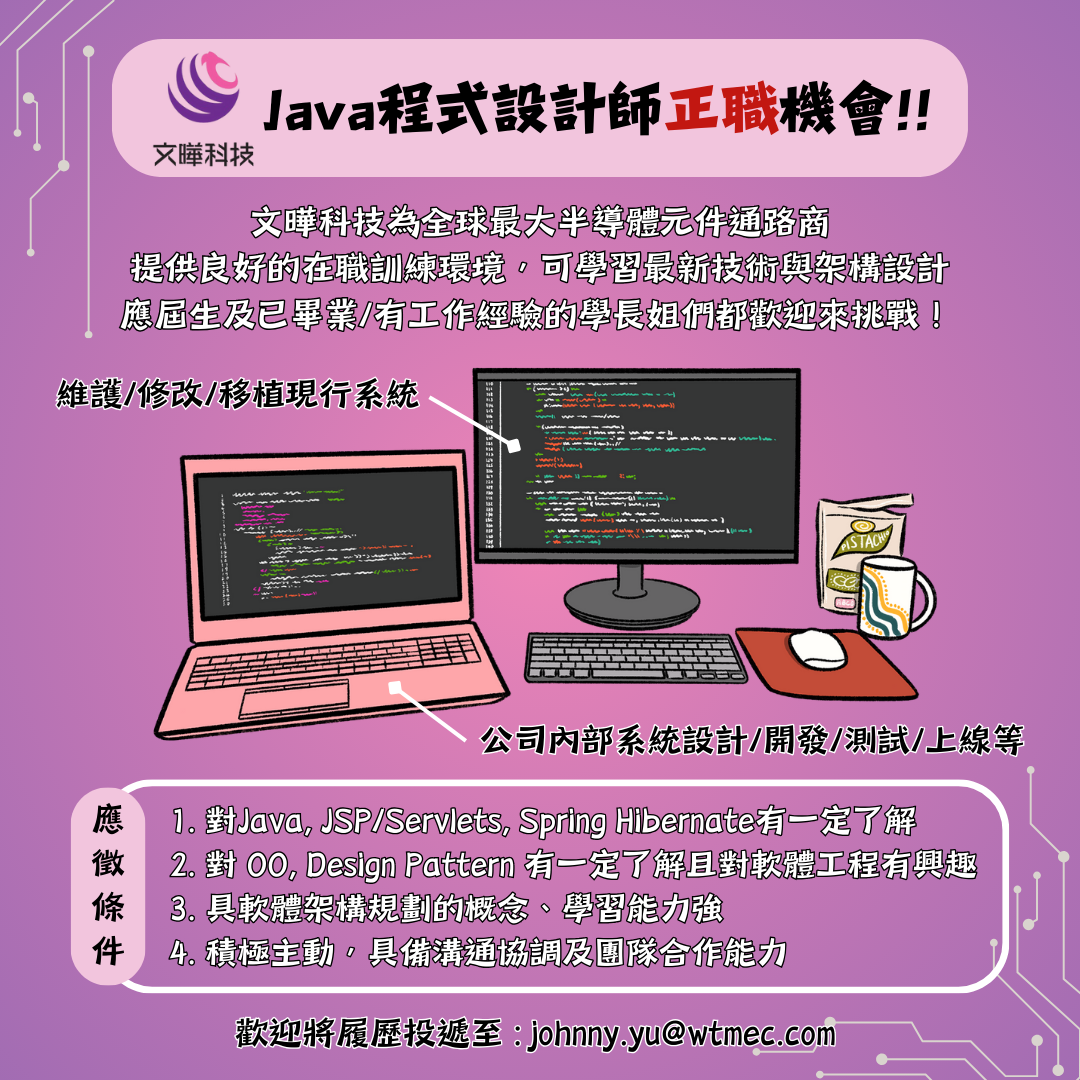 徵求條件:已畢業 or 應屆畢業,對Java程式架構有學習熱忱 (中央資管優先錄取)