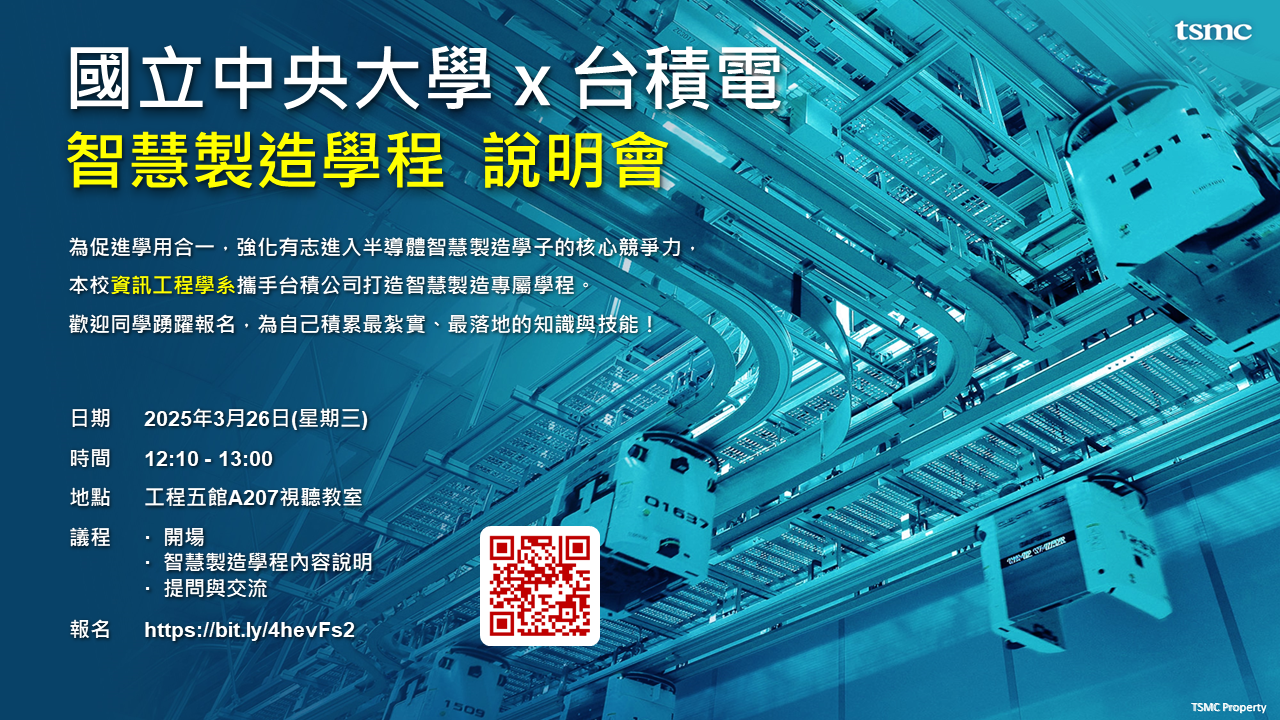 【說明會】國立中央大學 x 台積電「智慧製造學程」說明會, 2025/03/26, 1210 - 1300, 工程五館A207