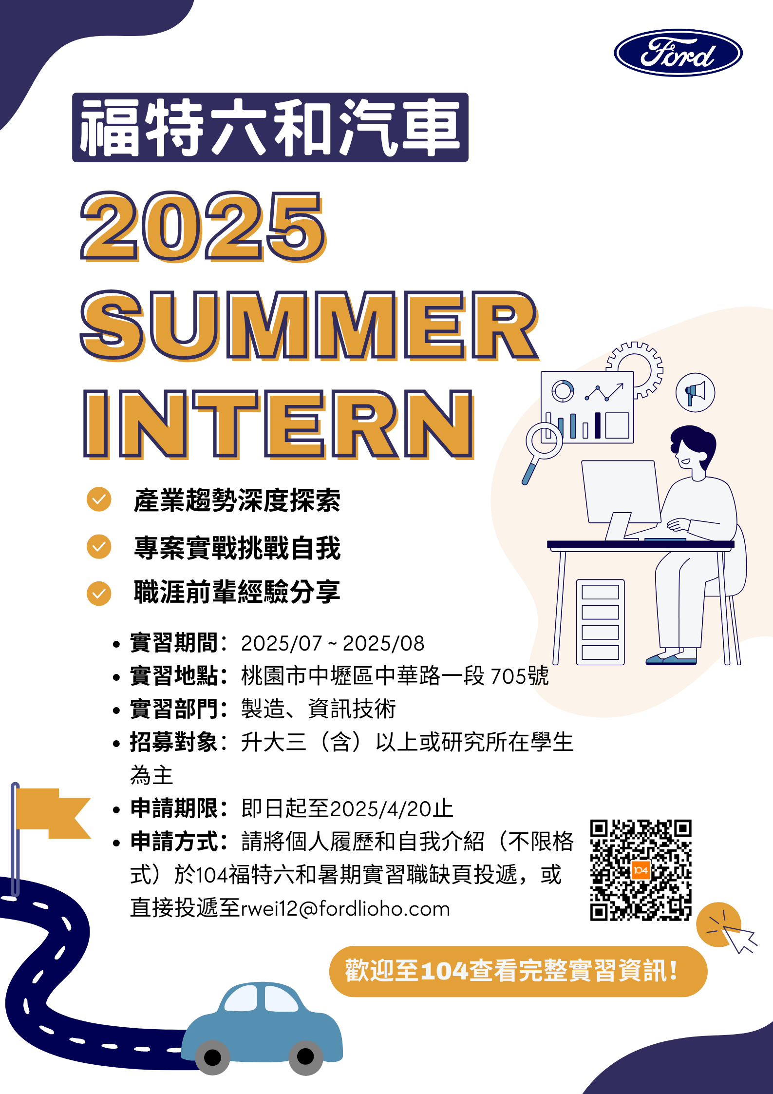 應徵資料收件至2025/4/20,詳細實習職缺內容和應徵方式請至104 福特六和汽車暑期實習生計畫頁面查閱:https://www.104.com.tw/job/8nl2i?jobsource=vipshare&utm_source=vip&utm_medium=share_copy