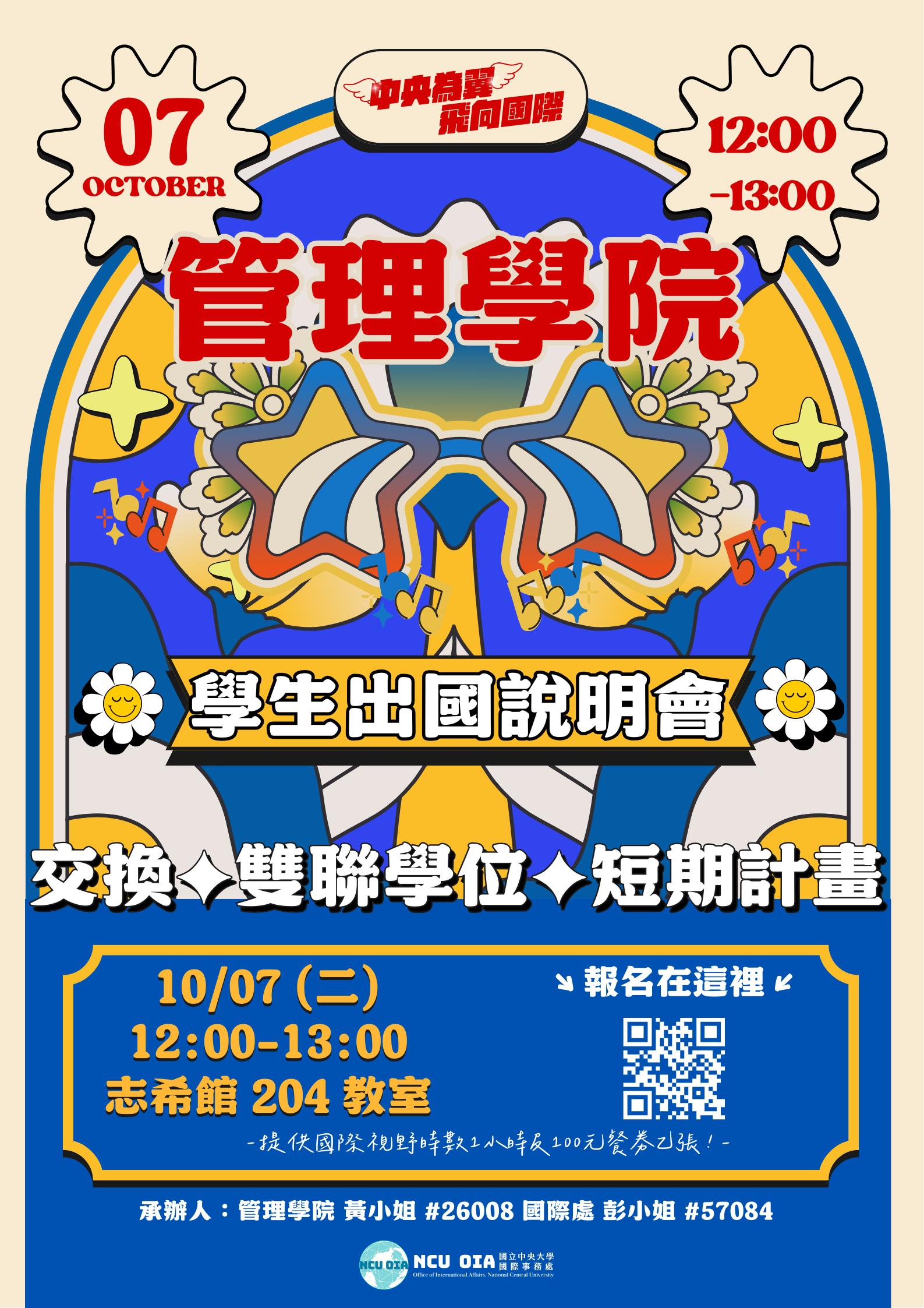 【說明會】管理學院學生出國說明會_10/07 (二) 12:00 / 志希館204教室