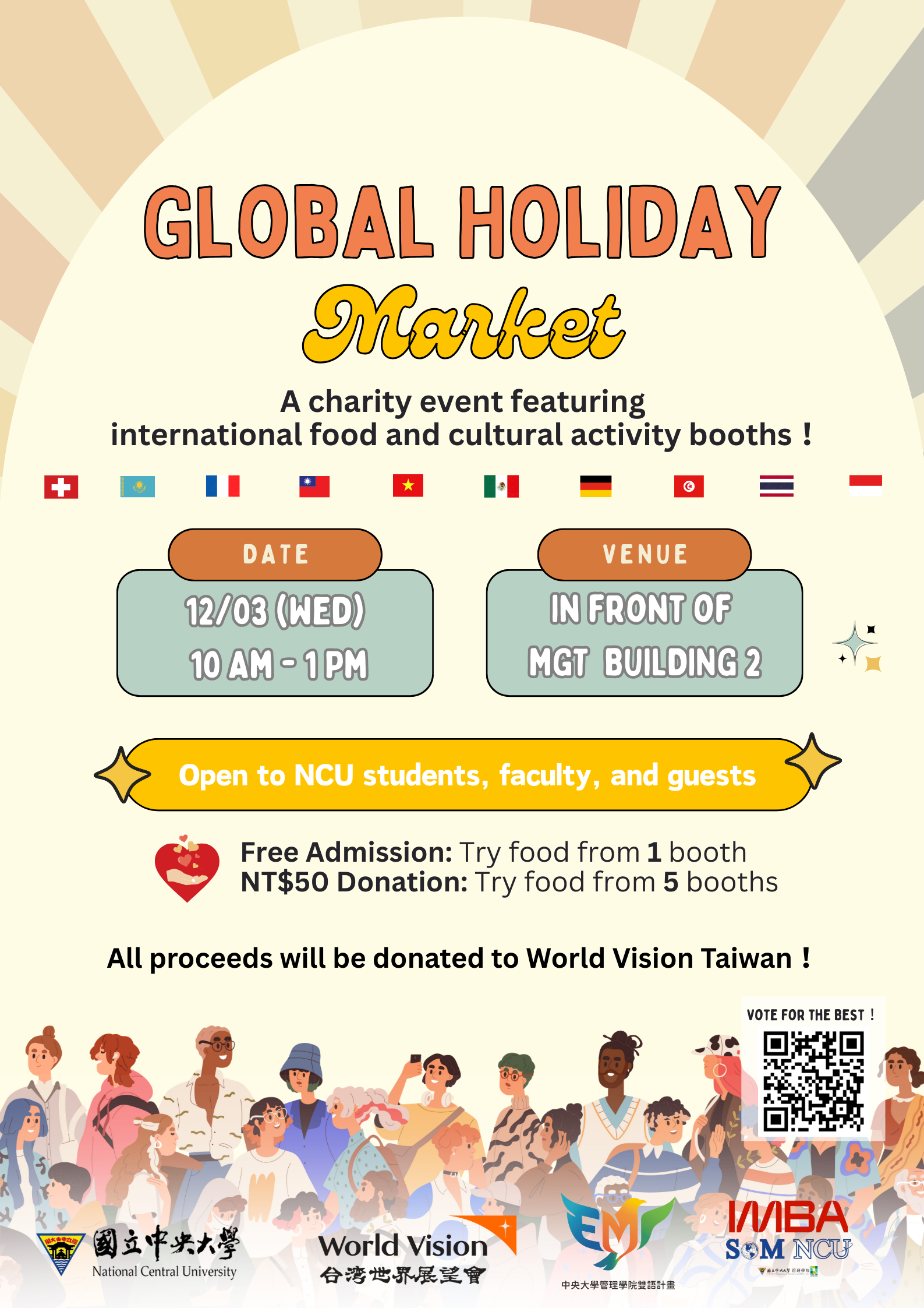 一起感受充滿節日氣息的市集氛圍,欣賞由學生精心準備的攤位展示、傳統美食及互動遊戲與活動,體驗來自世界各地的多元文化!